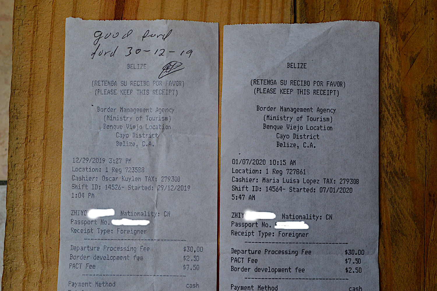 左边一张,就是第一次不能入境危地马拉,退回到伯利兹,伯利兹收钱的海关在收据上写上的注释(good paid for 30-12-2019+签名)。
