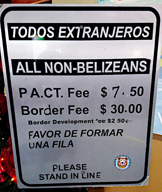到了伯利兹的关口,看到大厅里的牌子写着非伯利兹国的公民,离境时都要交40伯利兹币的离境税(40伯利兹币合20美金,接受伯利兹币或美金付款)。