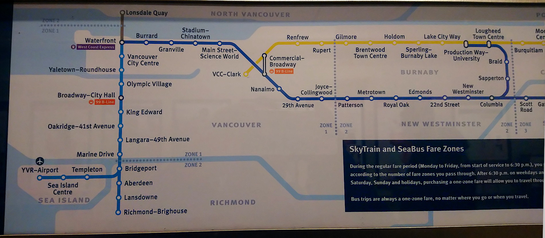从温哥华YVR机场,坐canada line可以直达到市区中心的 water front 站(算是1区)