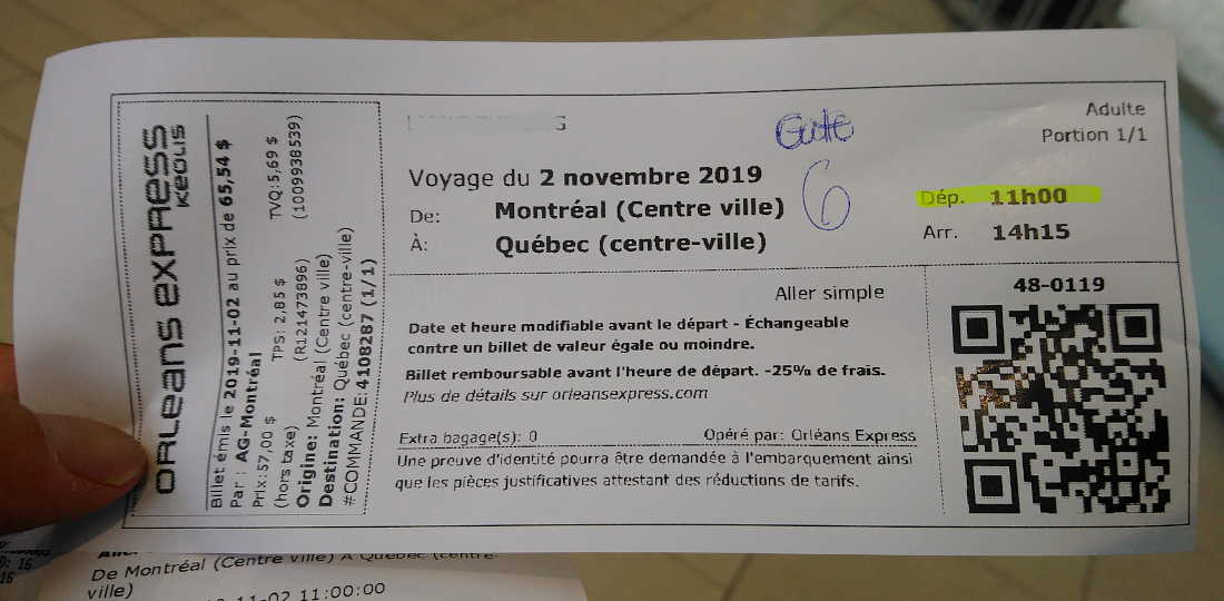 orleans bus到quebek的车票,票价65.5加币,行程3小时15分