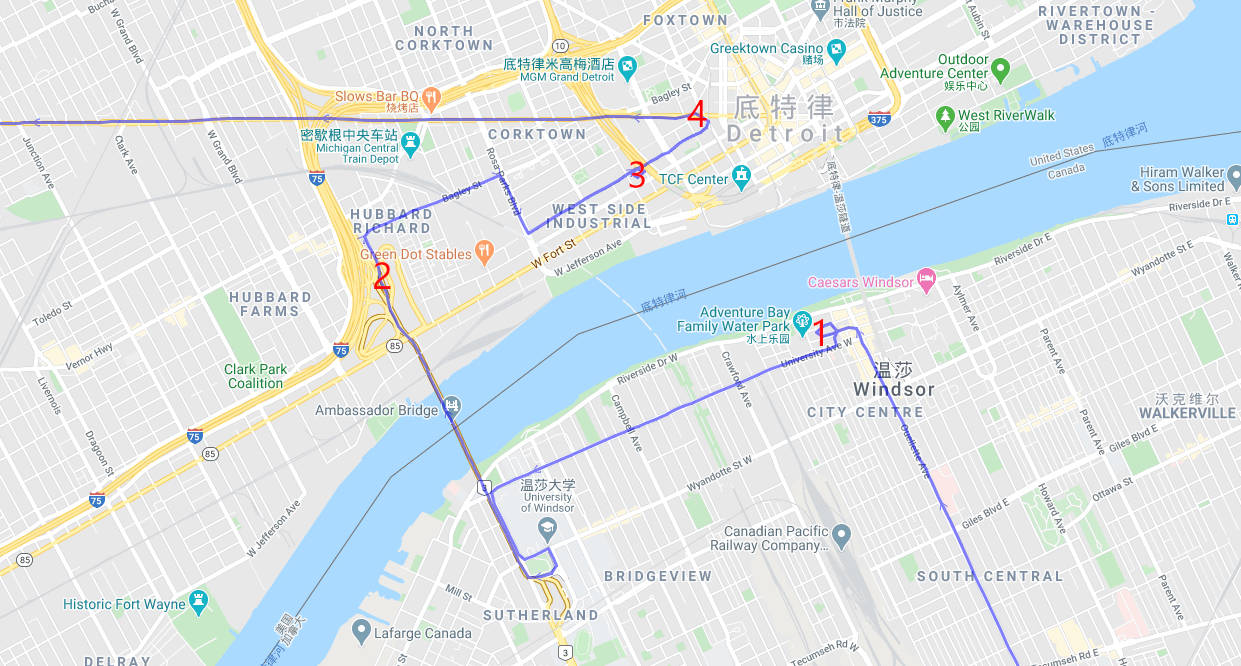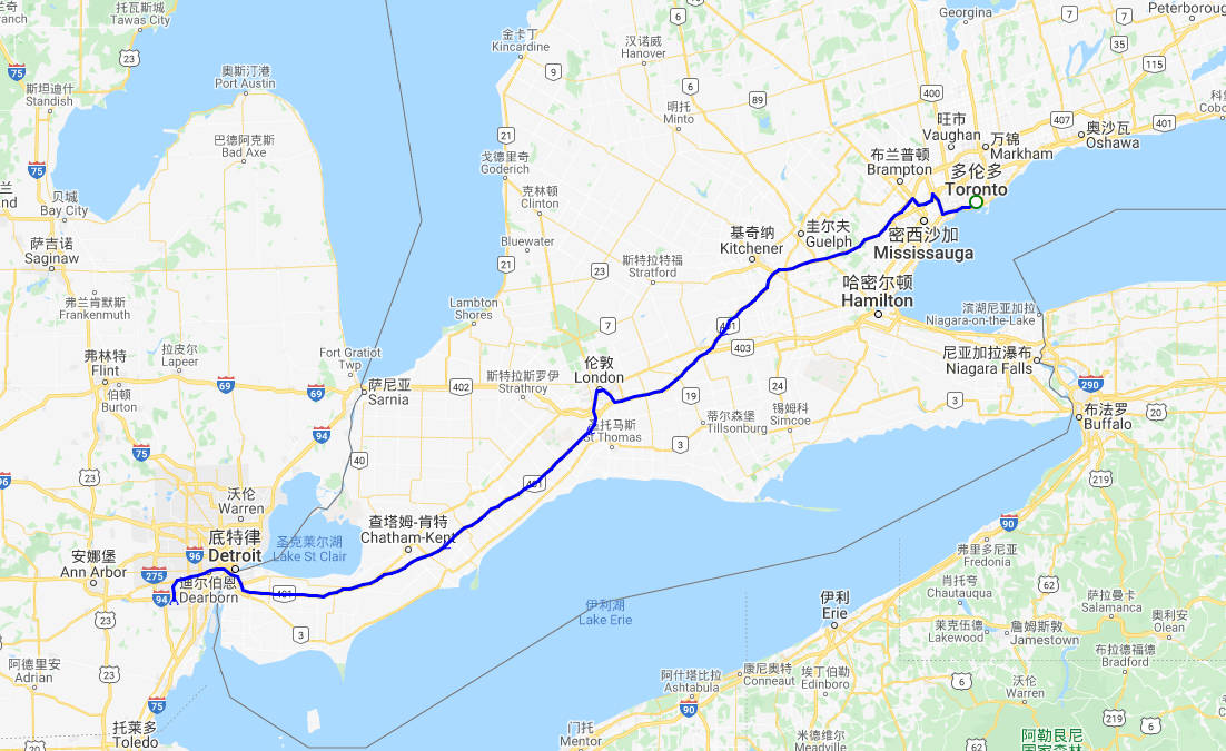 上地图为,从加拿大的多伦多陆路过境到美国的底特律,所记录的GPS轨迹