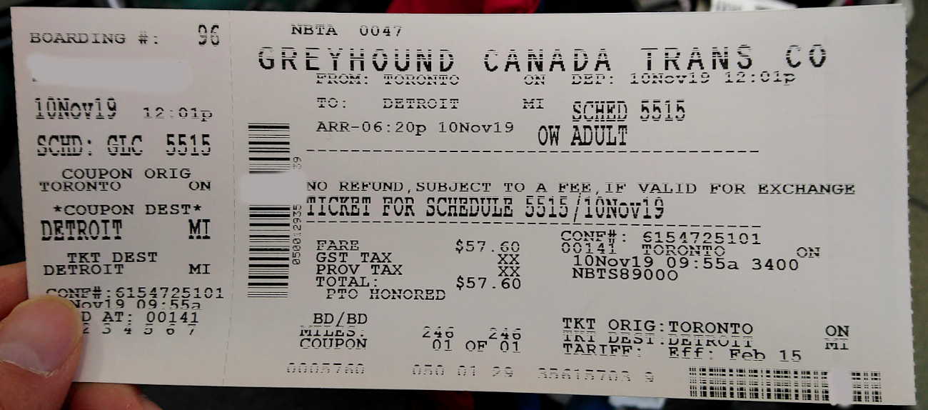 从多伦多到底特律的灰狗车票,57.6加币,行程6小时20分