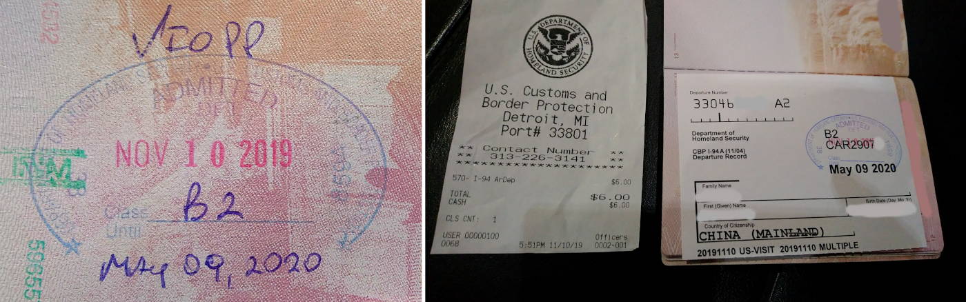 美国的入境章,停留期6个月(左),入境美国时收费6美金的收据及入境停留期的收据(右)