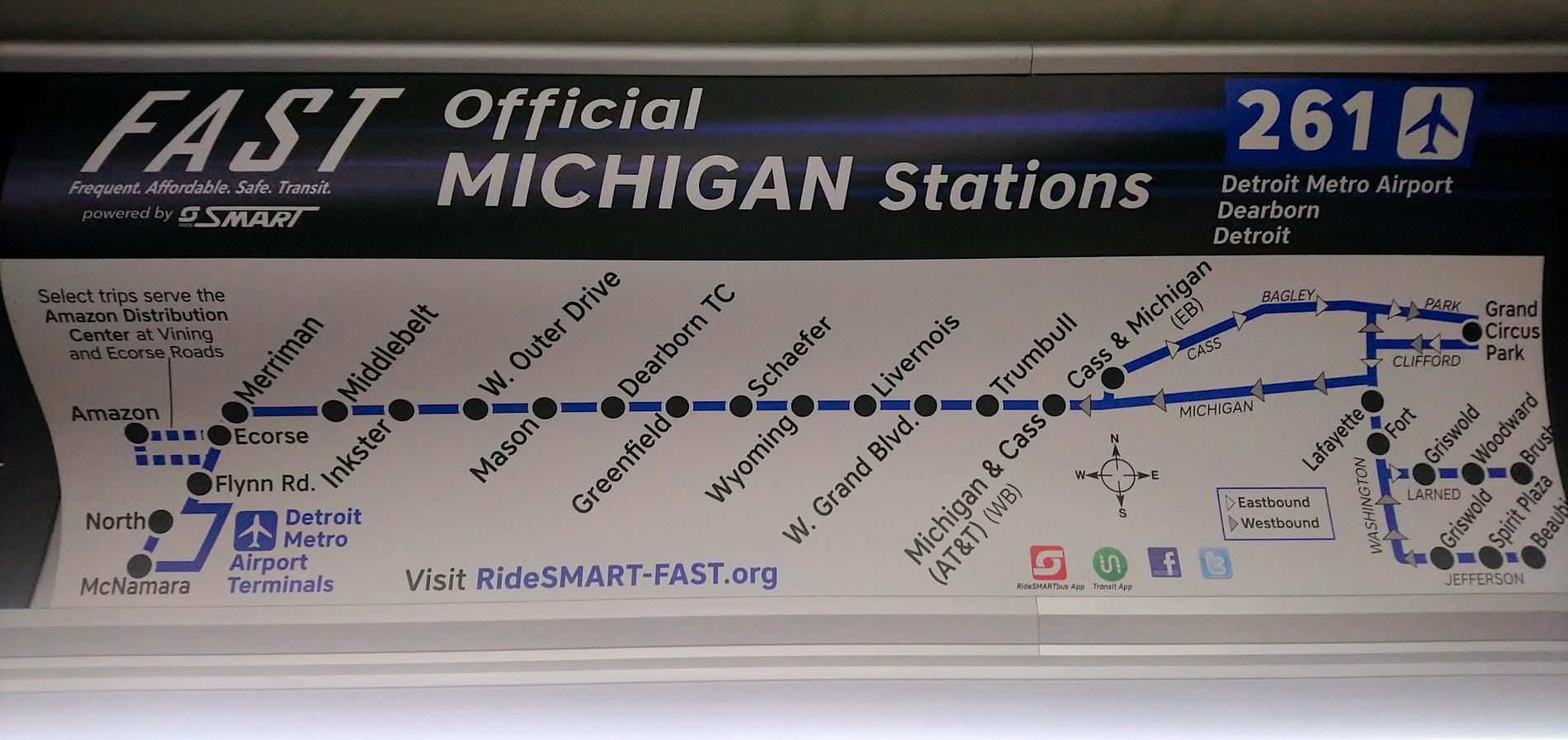 底特律,261路公交车的路线图,(提前可在谷歌地图上查好,从灰狗车站坐哪路公交车到机场,并在地图上做好标识)。