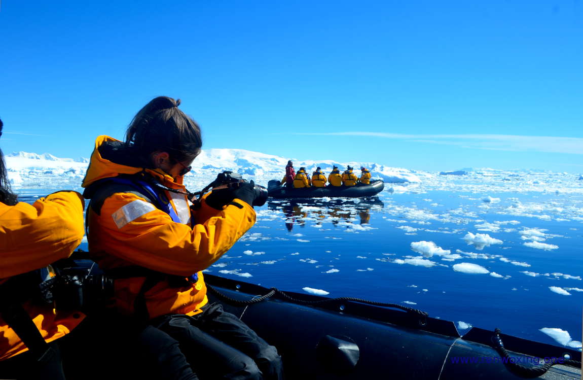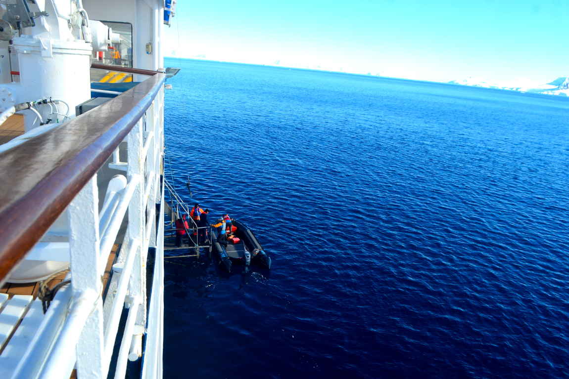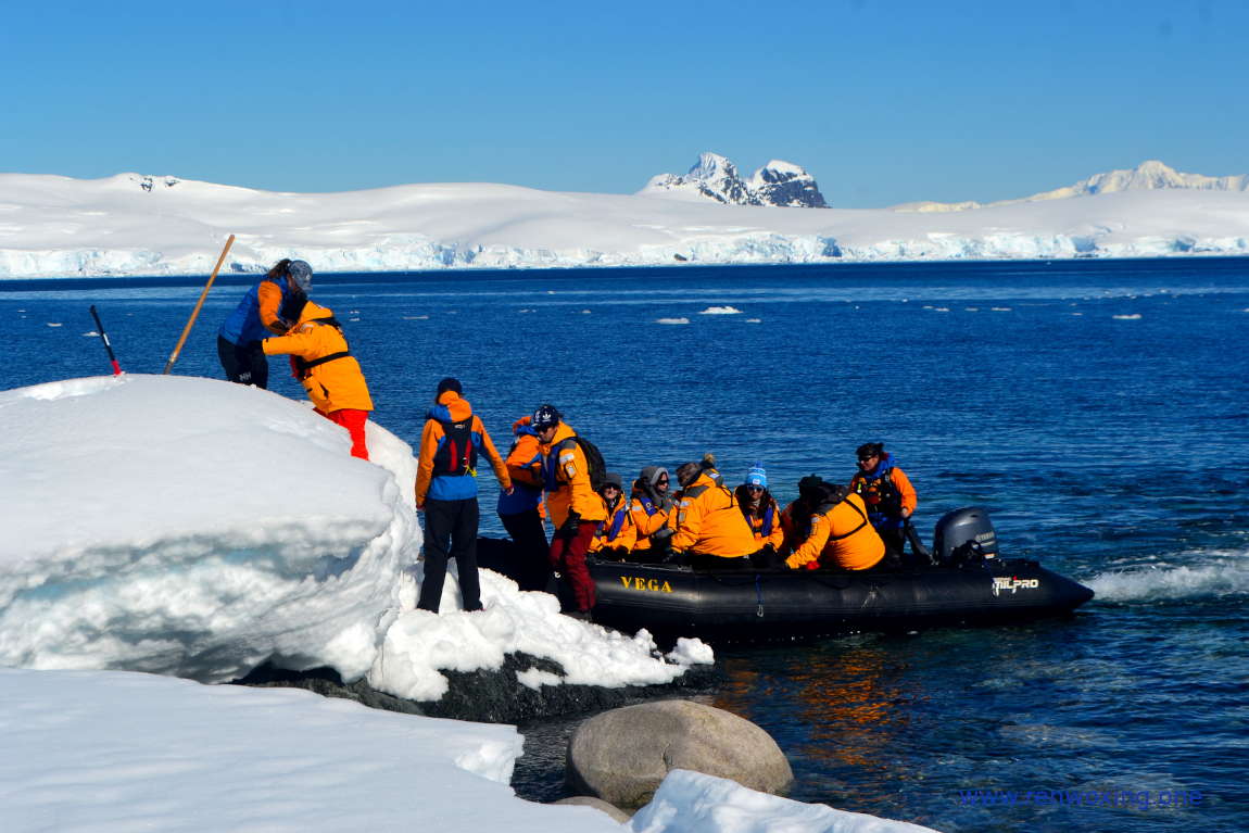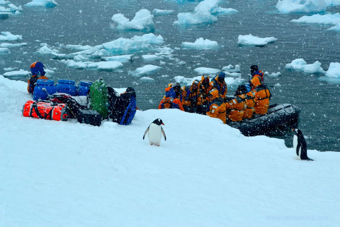 抵达南极半岛后(Charlotte Bay), 船上的领队就从破冰船上释放小型登陆艇,让破冰船上的乘客可以坐着登陆艇,登陆南极大陆。