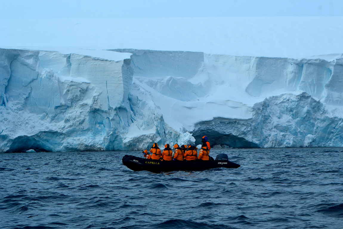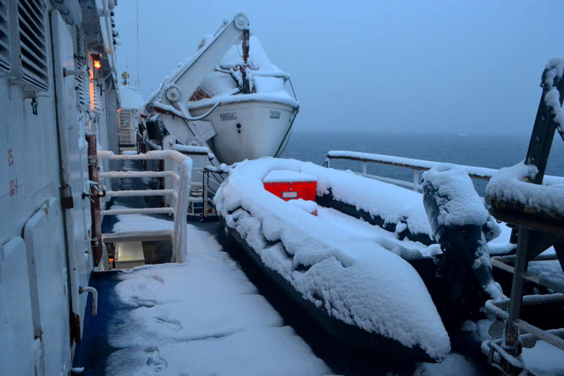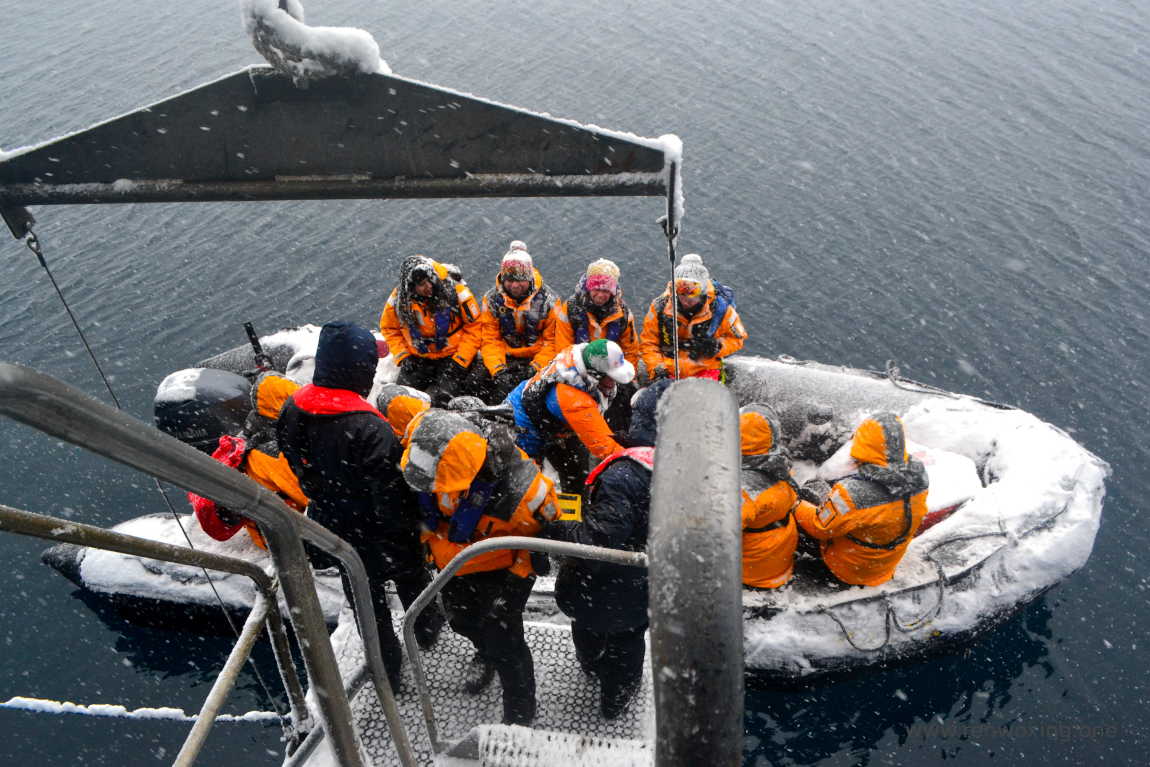 在暴风雪中,从登陆点坐小艇回到破冰船上
