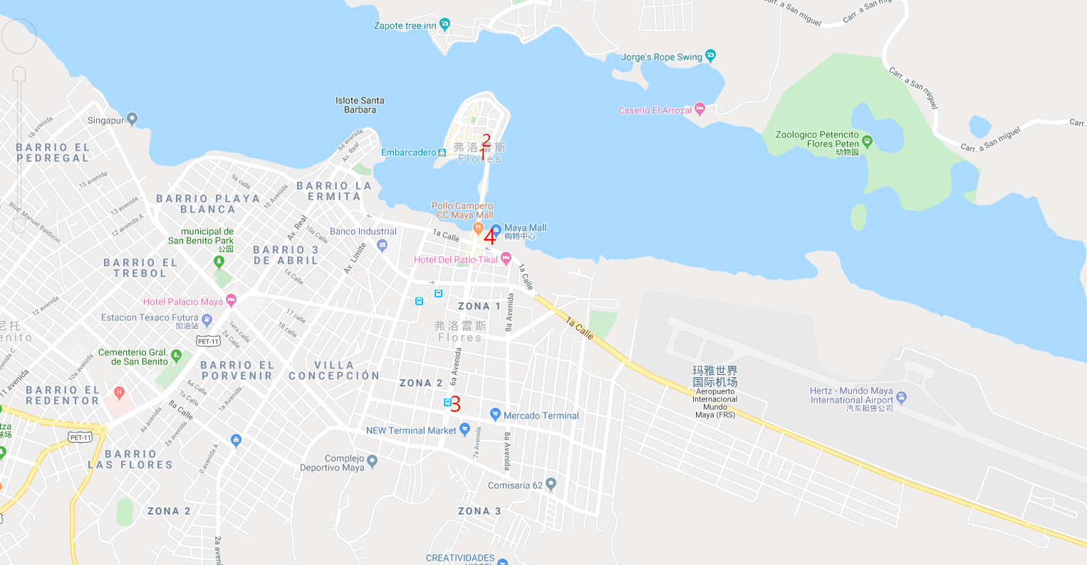 这次去tikal 玩时住的地方,是在flores岛上的, 由于考虑到岛上离车站还有1.7公里,坐tutu车要10块钱,如果是早上,找tutu车是否方便等问题,很多游客发直接在岛上找旅行社或旅馆,进行预定交通的。