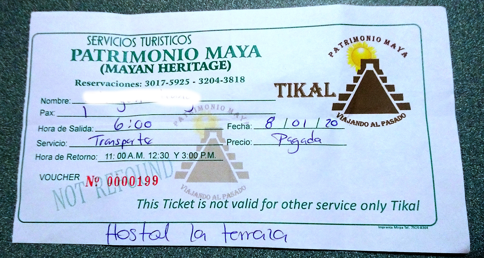 在岛上问了几家旅行社,到tikal景点的来回车票价格都是80危币,于是就在旅馆里,通过旅馆进行预定了来回的交通,80危币.( 共有3趟车,4AM,6AM,8AM的,价格都是一样)。