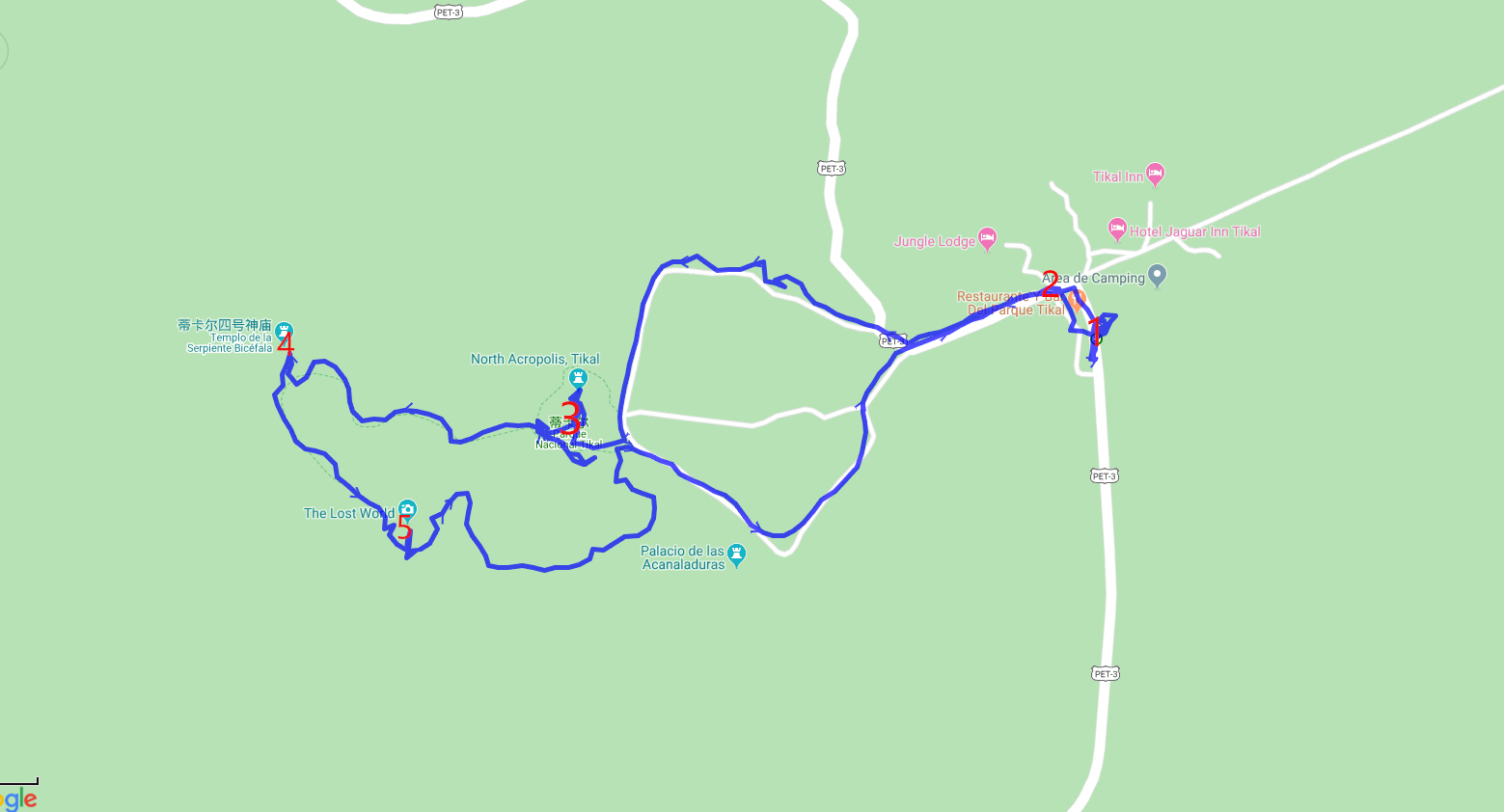 上图为 Tikal景点的地图及本次步行记录的GPS轨迹