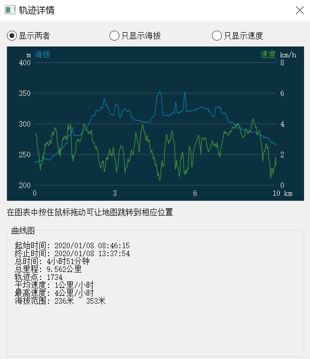 本次步行GPS轨迹的统计数据,总时间为4小时51分,总里程9.5公里。