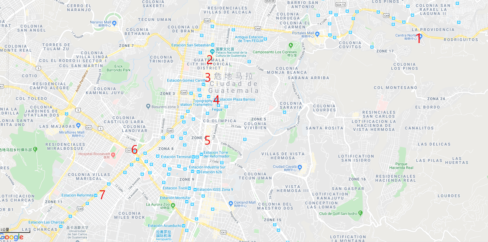 危地马拉城的地铁图,中心枢纽就在铁路博物馆附近的plaza barrios站。