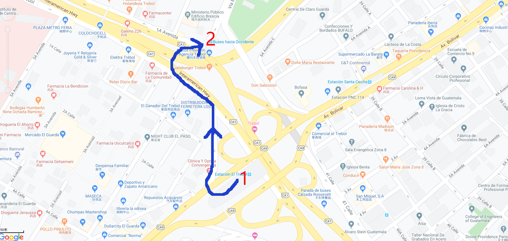 trebol地铁站附近放大地图及从地铁站到chicken bus停靠处的步行路线, 过马路都有天桥的,一路步行过去就是了。