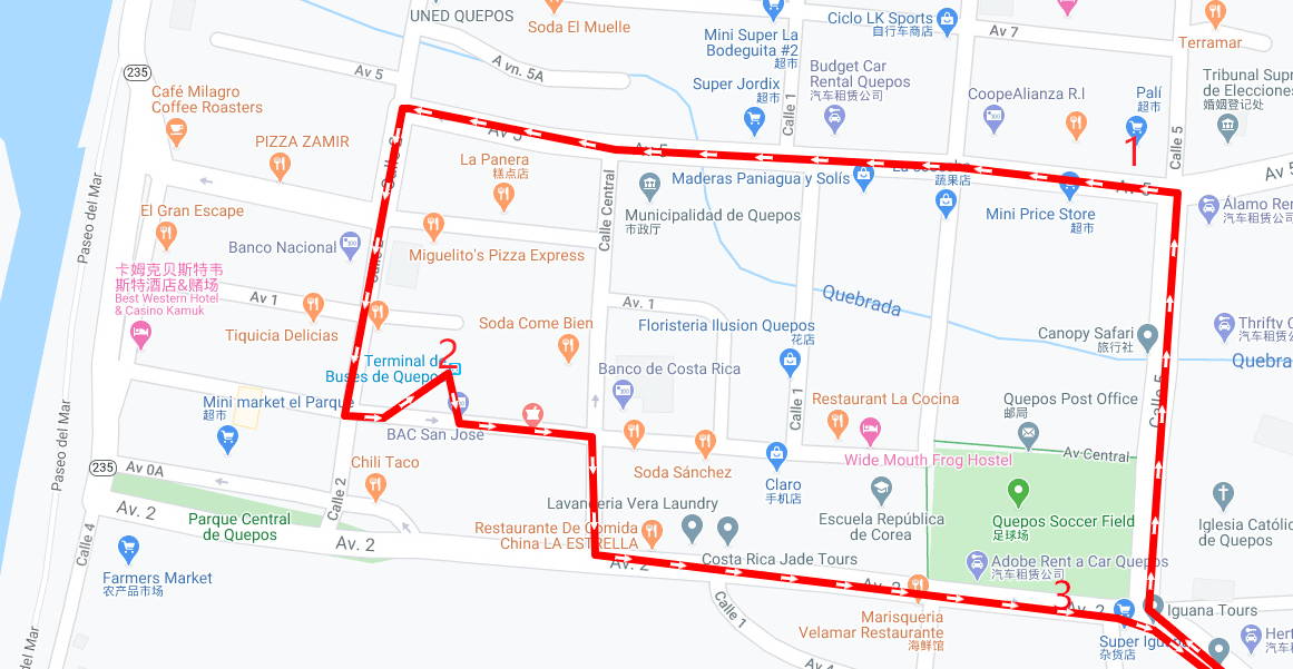 往来Manuel Antonio与quepos的公交车,在quepos镇上的行驶路线