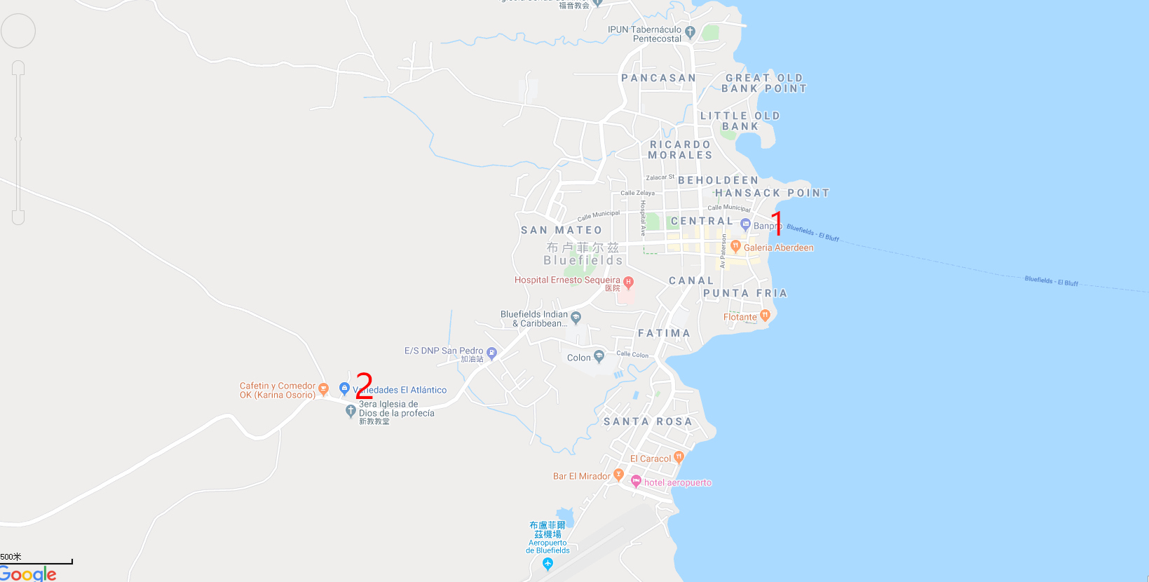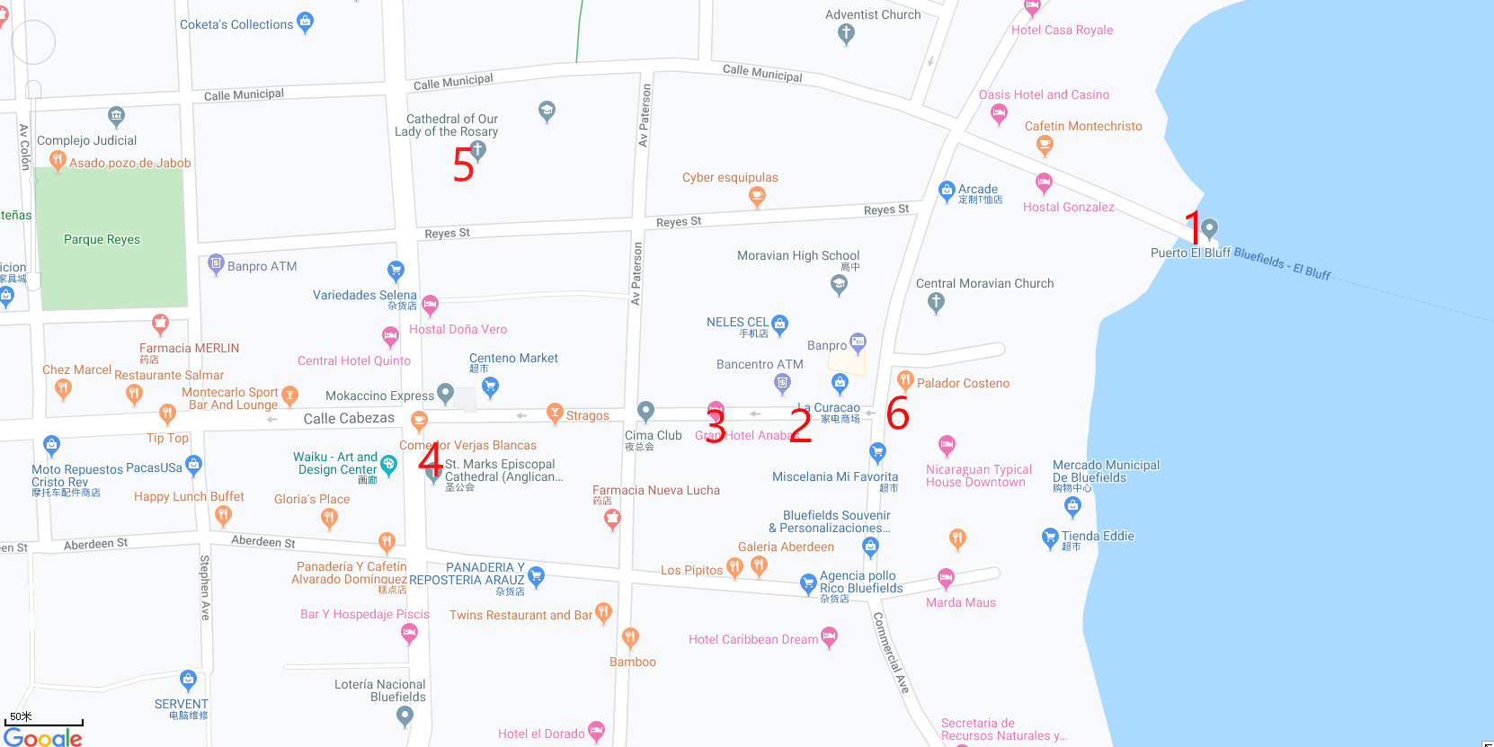 地址 Calle Cabezas, Bluefields(如地图,就在靠经码头的主大街上)