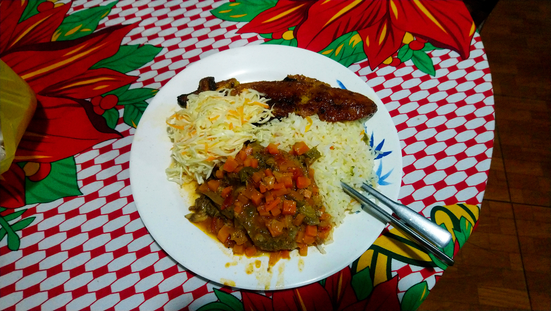 当地菜 ,牛肉,蔬菜,米饭,沙拉,和炸香蕉。