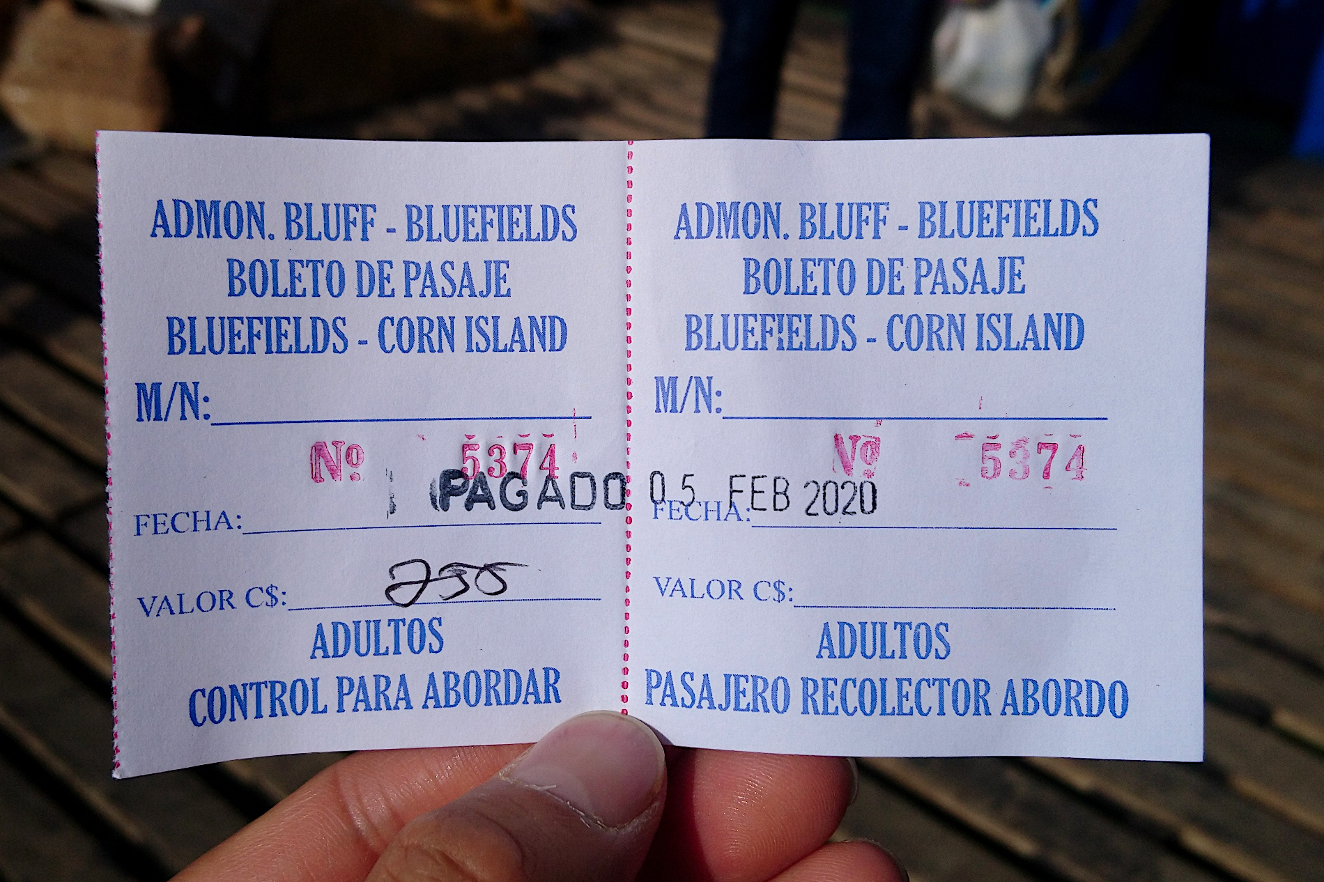 bluefields到大玉米岛的船票,255尼币, 船上现场买票