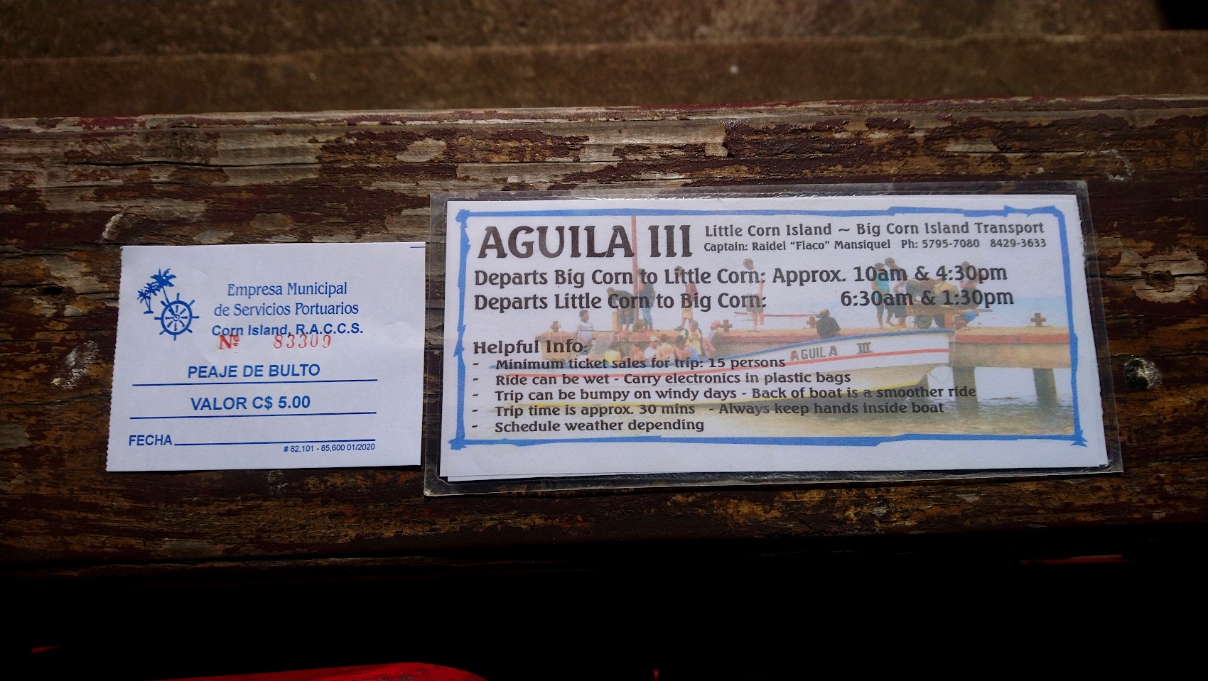去Little corn 的船票及boarding pass, 160尼币(合5美金)