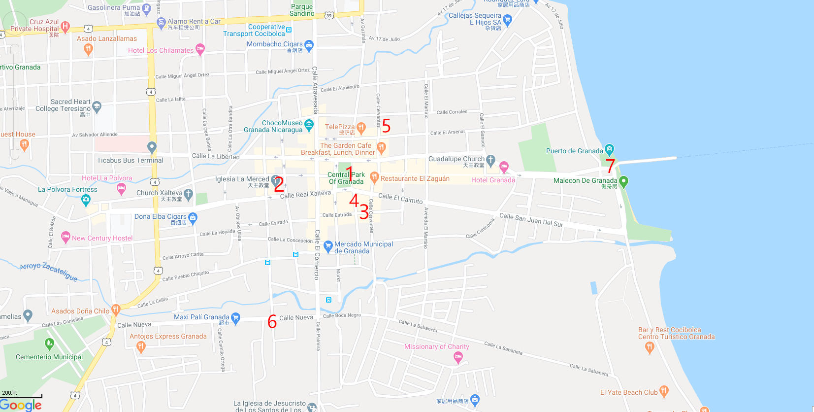 连接managua的中巴,都是停靠在 terminal de buses granada(如上地图中4所示,到managua票价33尼币,耗时1.5小时)