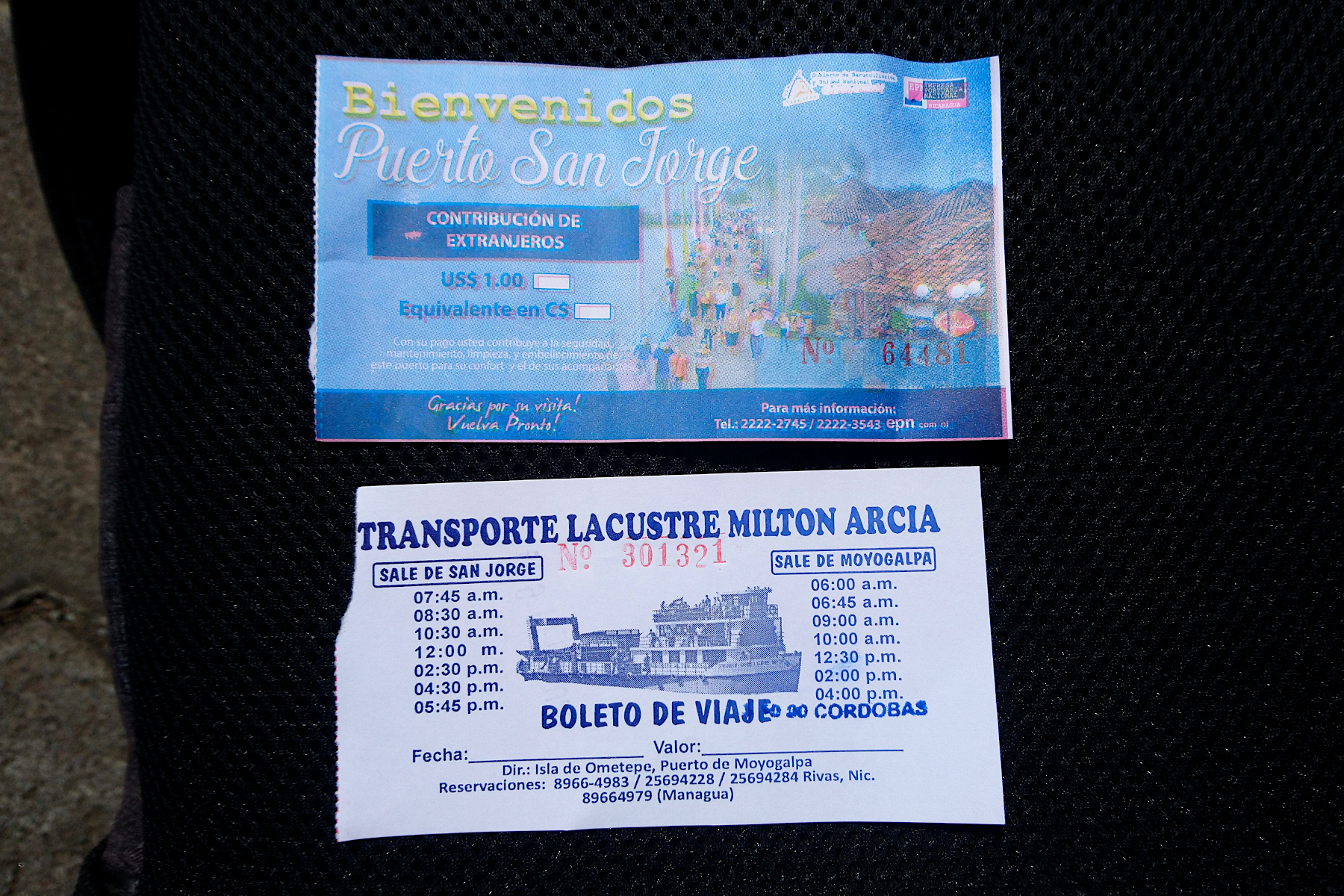 san jorge码头对外国人收取码头费33尼币或1美金(上),从san jorge到moyogalpa码头的船票 50尼币(下)。