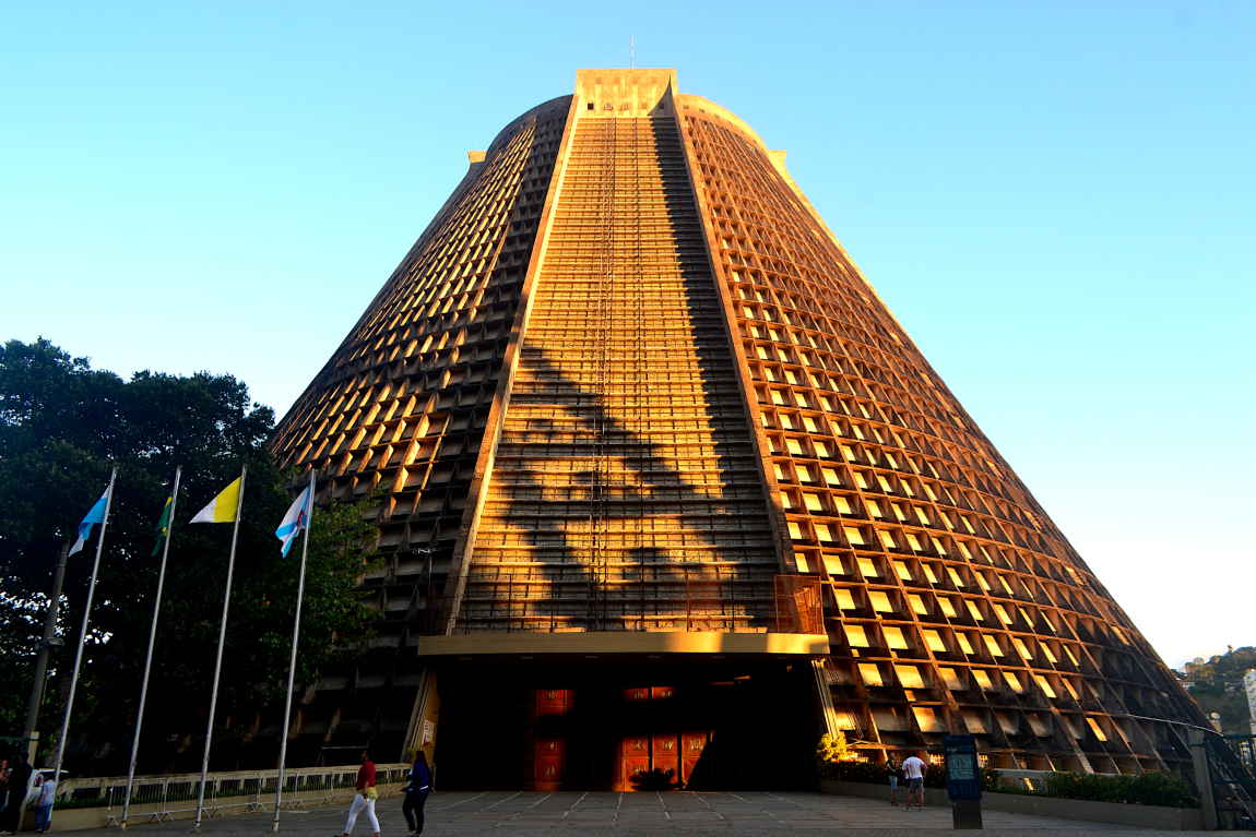 大教堂是基于现代风格,由埃德加·奥利维拉·达丰塞卡·设计的 ,玛雅金字塔建筑风格。当前的大教堂建于1964年至1979年之间,取代了自1676年以来的大教堂,作为大主教管区的所在地,其中最近和最著名的是古代卡梅尔山圣母教堂,现称为旧大教堂,建于18世纪,并在19世纪初被宣布为里约热内卢大教堂。