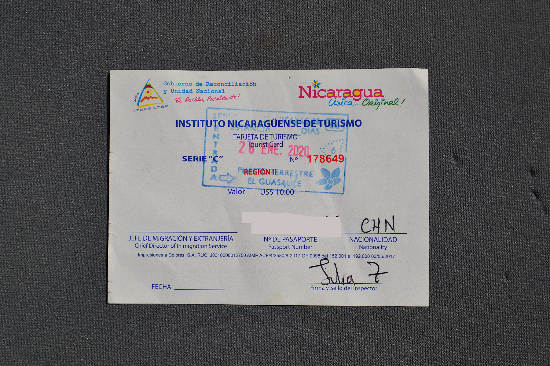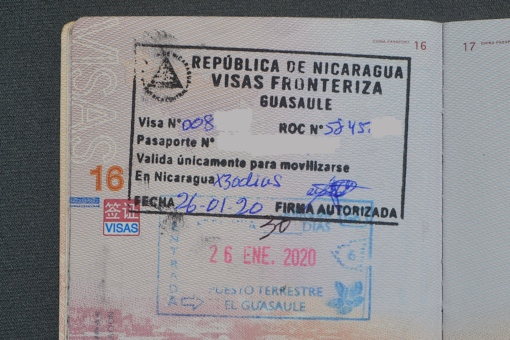 等汽车的服务员把一切准备好了,然后就让我面试。(面试时问的问题是,你是什么时候离开中国的?走了那些国家?从美国开始走的?尼加拉瓜后,你要去那里?你的职业?你身上有多少现金?单身或结婚? 定了那家酒店?打算在尼加拉瓜待多久?)。面试结束时,面试官直接告诉我,你已经通过了,大巴的服务员继续帮忙跑单,让我回到大巴上等签证。尼加拉瓜入境总共花费1小时。