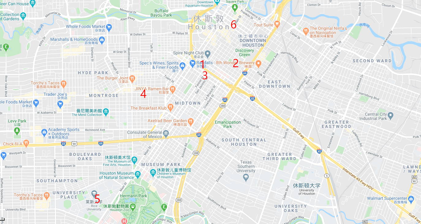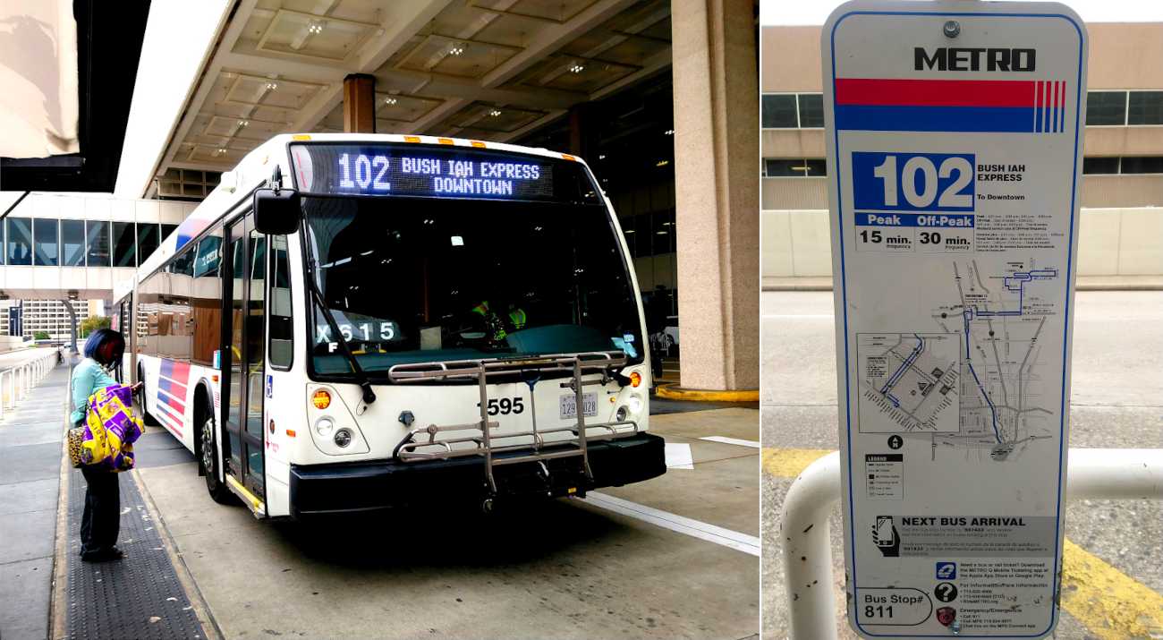 从休斯顿乔治布什国际机场到市区中心,可以在机场的航站楼C(机场的各个航站楼间,有免费的有轨电车连接),坐102路公交车,直达市区中心,下客点距离地铁站downtown transit center只有130米。