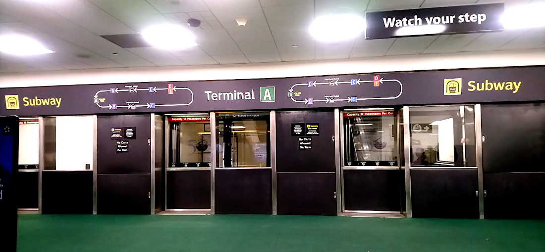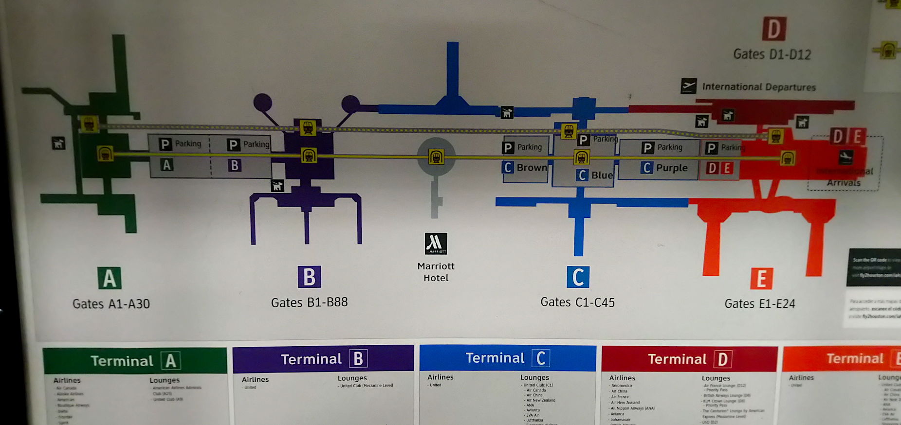 休斯顿国际机场的布局图,到市区的102路公交车,在航站楼C的门外