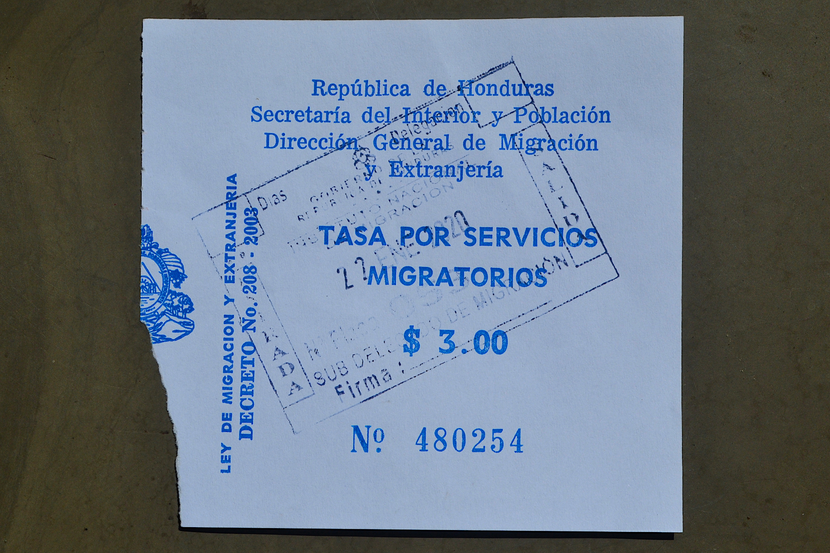 洪都拉斯入境时,缴费3美金的收据(直接收美金)